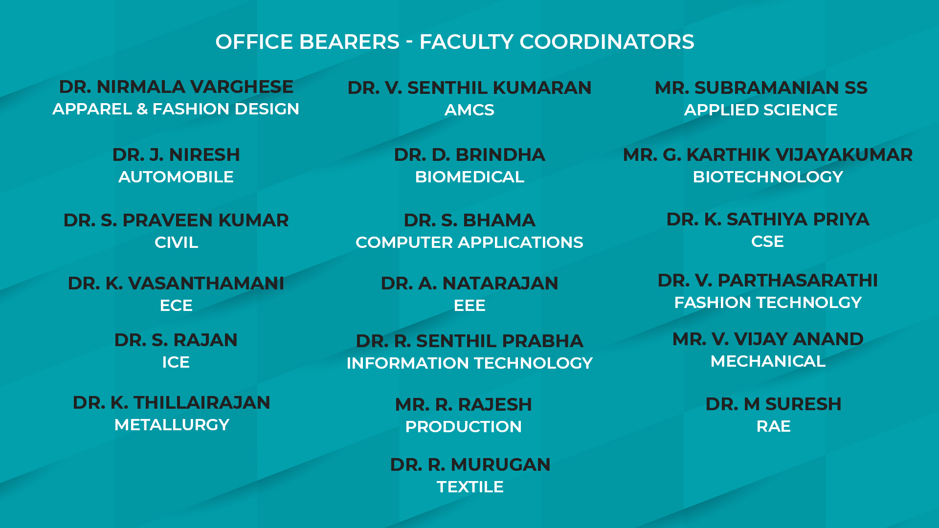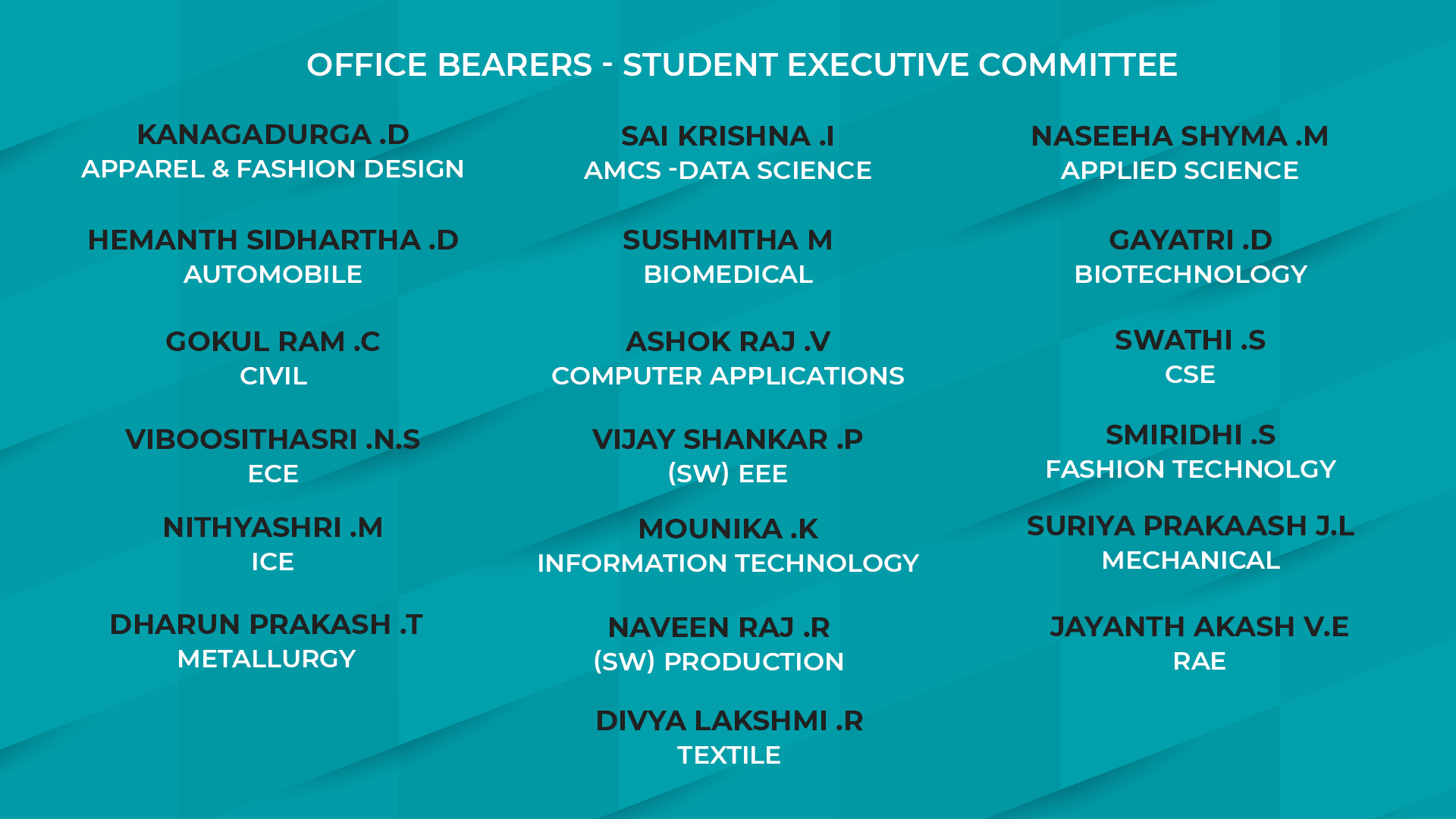 A unit initiated by Principal Dr.K.Prakasan, Dean Dr.R.Nadarajan, and Associate Dean of Placement and Training cell Dr.R.Engels , the coding club is constituted by a team of representatives comprised of one member each from the Student Executive Committee of all departments, functioning, under the expertise of Faculty Advisor Dr.V.Senthil Kumaran.